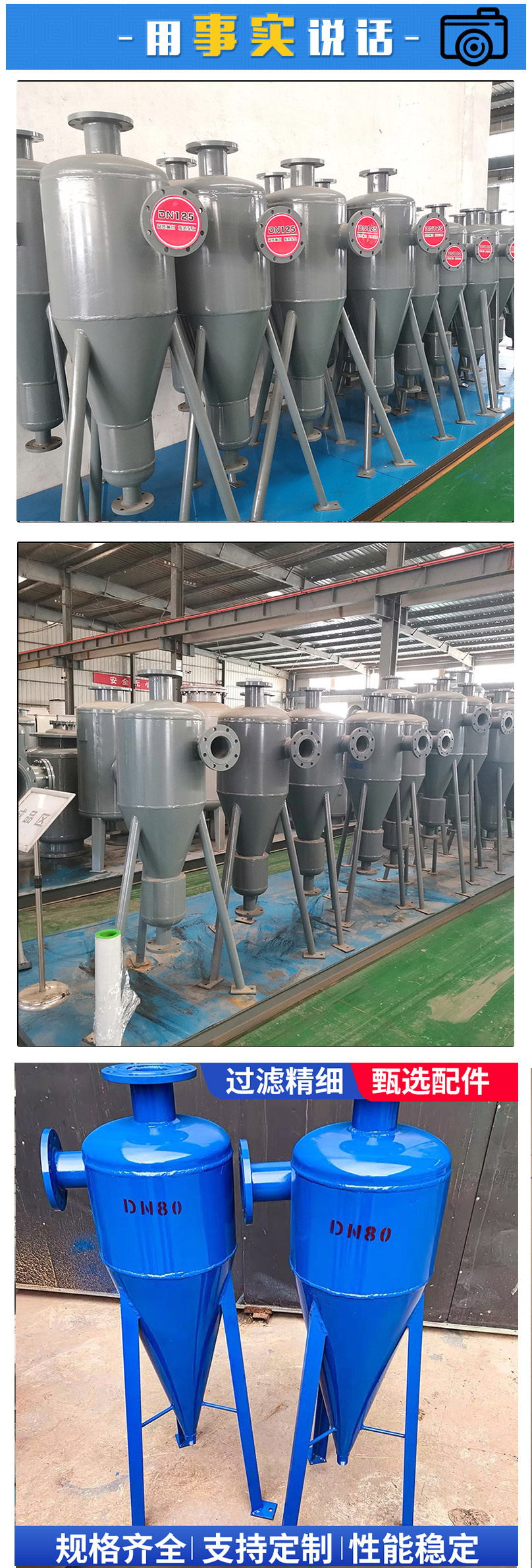 在一定范圍和條件下,除砂器進(jìn)水壓力越大,除砂率越高,并可多臺(tái)并聯(lián)使用。工藝流程:原水-旋流除砂-精密過濾-儲(chǔ)水池-用戶旋流除砂器是根據(jù)離心沉降和密度差的原理,當(dāng)水流在一定的壓力下,從除砂器進(jìn)口以切向進(jìn)入設(shè)備后,產(chǎn)生強(qiáng)烈的旋轉(zhuǎn)運(yùn)動(dòng),由于砂水密度不同,在離心力、向心浮力、流體曳力的作用下因受力不同,從而使密度低的清水上升,由溢流口排出,密度大的砂由底部排砂口排出,從而達(dá)到除砂的目的。在一定范圍和條件下,除砂器進(jìn)水壓力越大,除砂率越高,并可多臺(tái)并聯(lián)使用